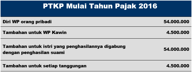 Dengan diberlakukannya Peraturan Menteri Keuangan Nomor 101/PMK.010/2016 tentang kenaikan besaran Penghasilan Tidak Kena Pajak (PTKP) yang berlaku mulai tahun pajak 2016. Sesuai PMK tersebut, besaran PTKP wajib pajak orang pribadi naik menjadi Rp54 juta per tahun, dari sebelumnya Rp36 juta per tahun.